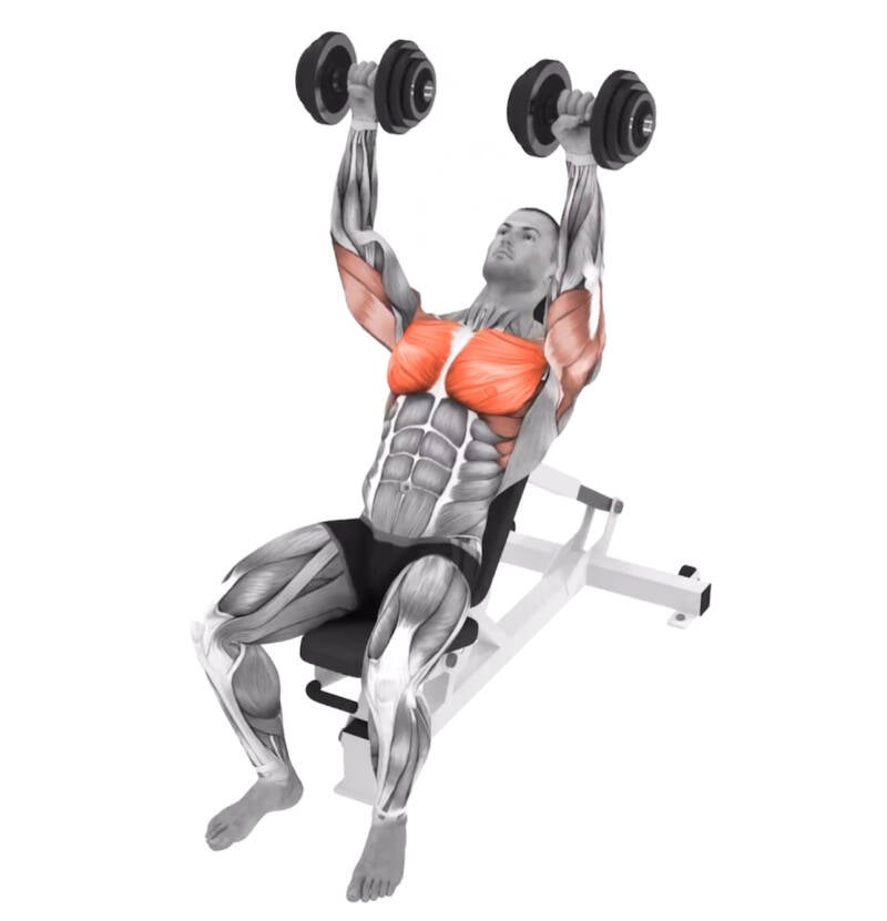 Este es un ejercicio excelente para desarrollar la parte superior de los músculos pectorales. Además de los músculos pectorales superiores, en el trabajo también se incluyen los siguientes músculos: los deltoides anteriores y el triceps. La diferencia entre este ejercicio y el press de banco inclinado con barra es que en este caso los músculos de trabajo se cargan más, ya que es necesario estabilizar el peso de las mancuernas.